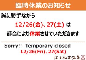 2025年12月26日、27日を急遽臨時休業とさせていただきます。